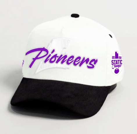 The Sideline brings crisp contrast and championship energy. With a white crown, black corduroy brim, bold Pioneers script, and a 2022 State Champs mark, it’s built for the fans who never missed a Friday night.